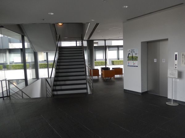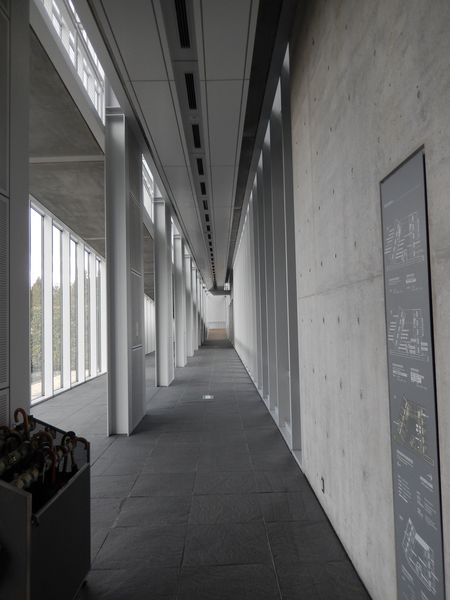 廊下。ガラス張りの正面から見えていた部分